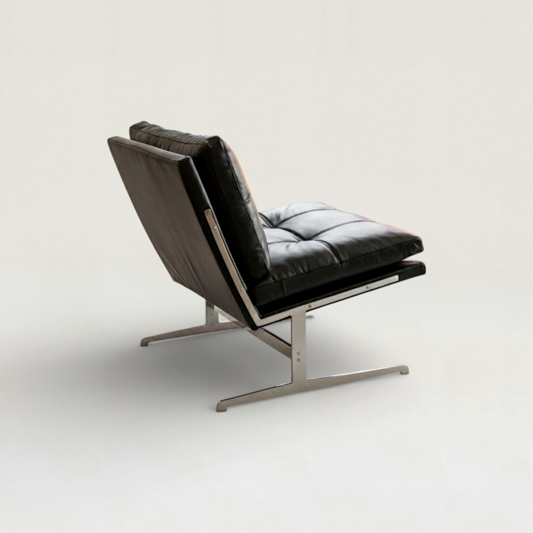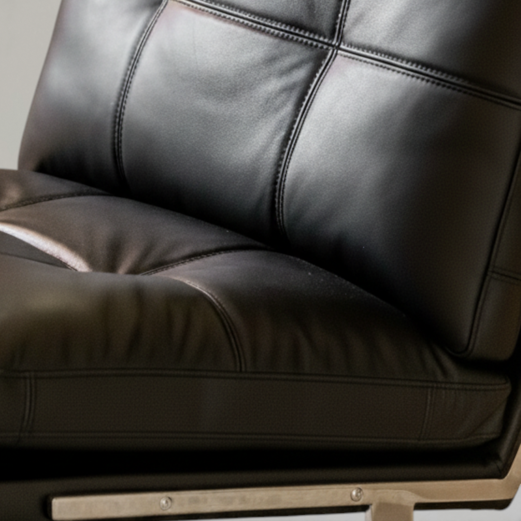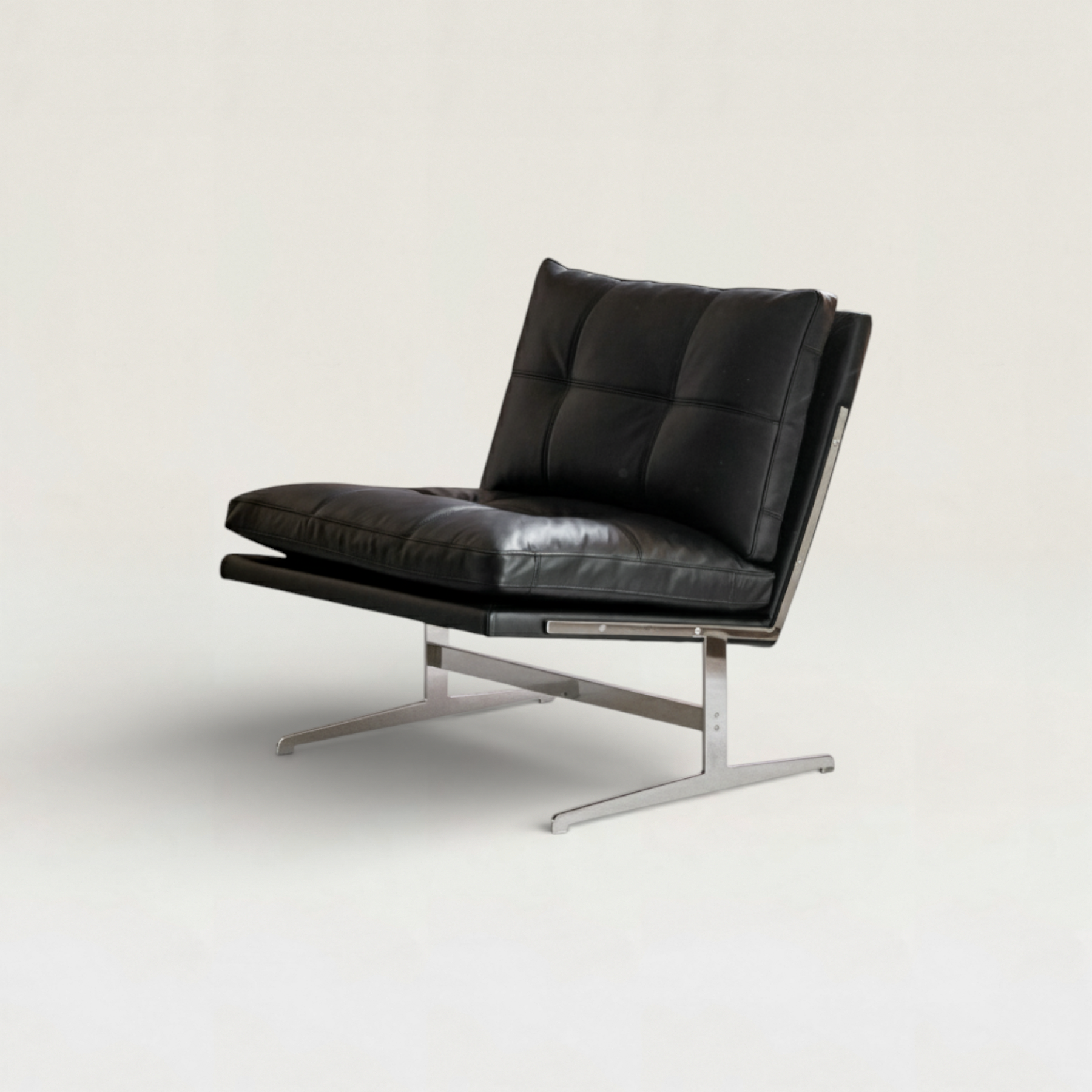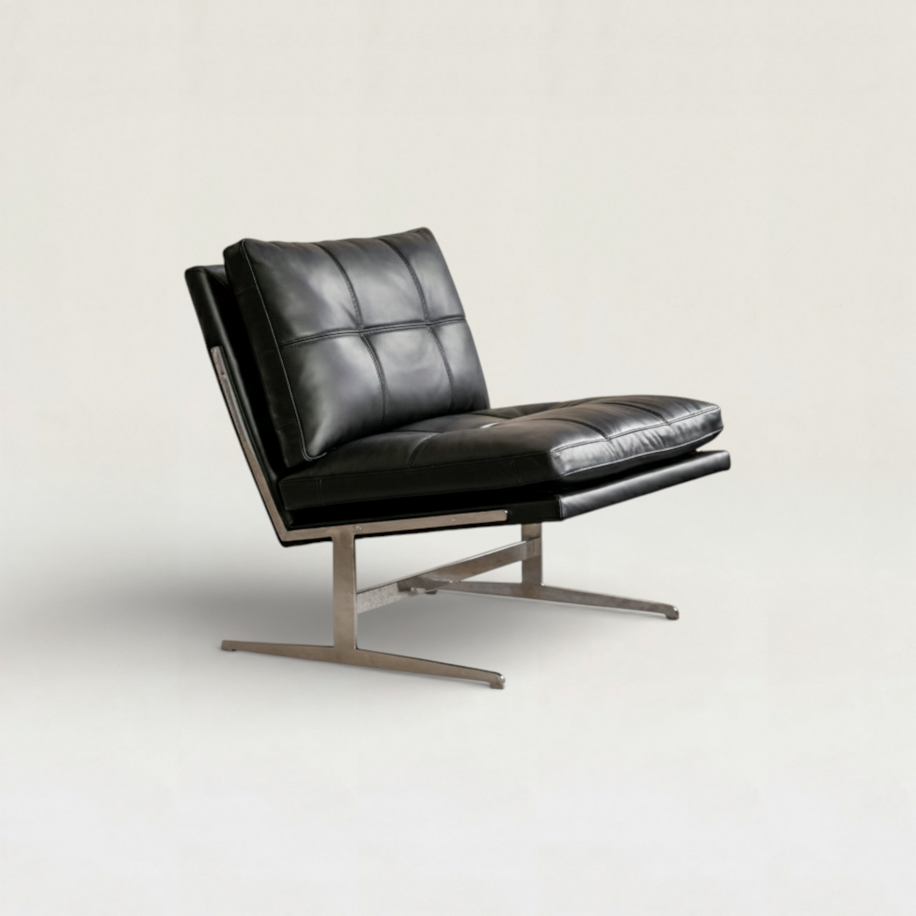 無駄を削ぎ落とした直線的な美しさと、重厚感のあるレザーの質感が融合したラウンジチェア。