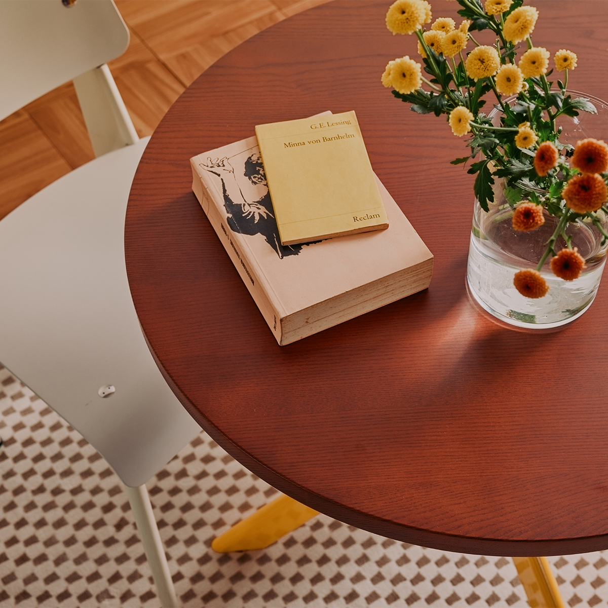 シンプルな円形が空間に自然と馴染み、愛着が深まります。海外ブランドのチェアとも合う高さに設計されています。