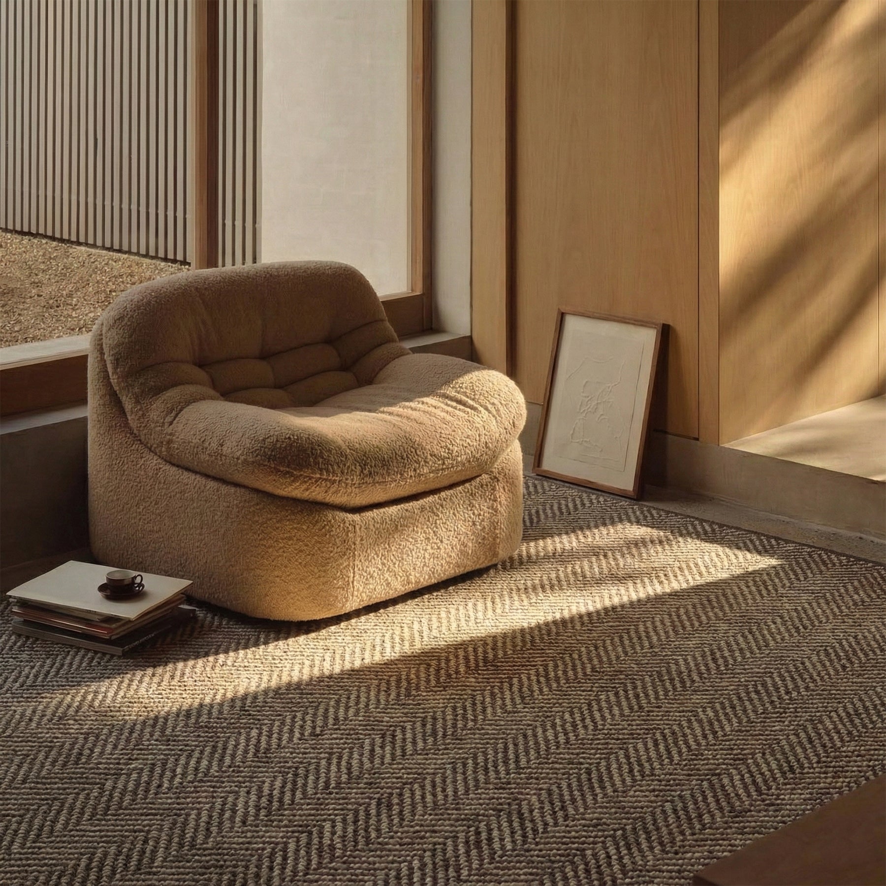繊細なヘリンボーンが空間に奥行きをもたらす、落ち着いた表情のHedra ラグ。