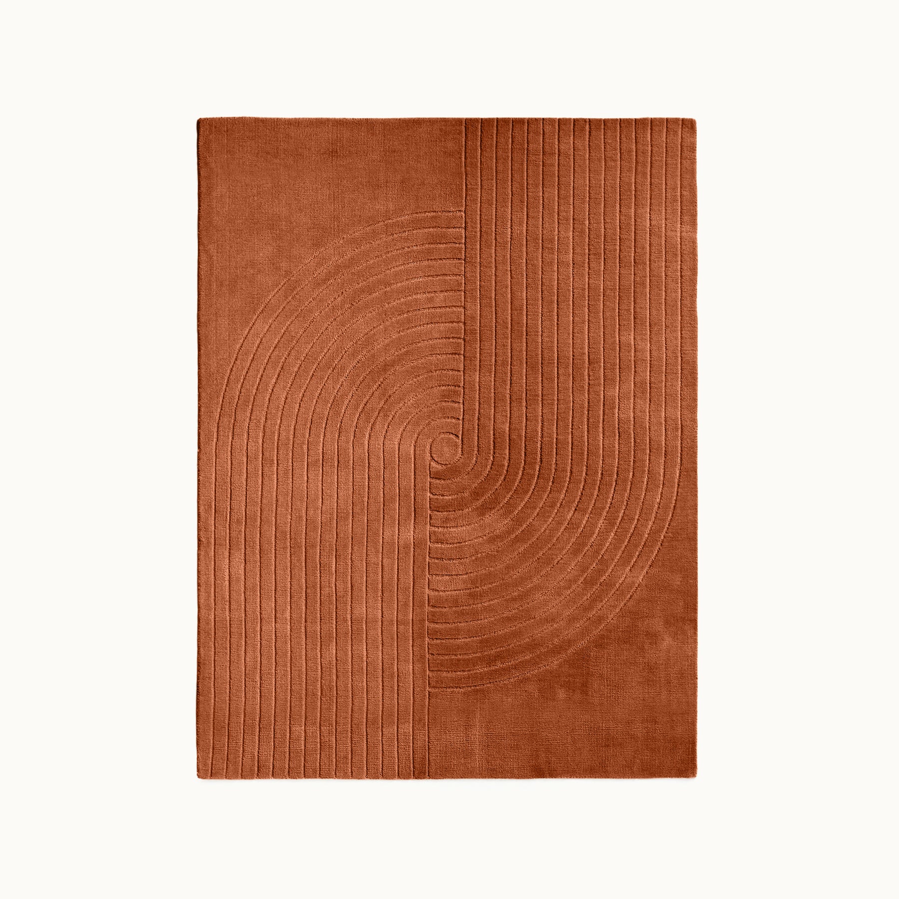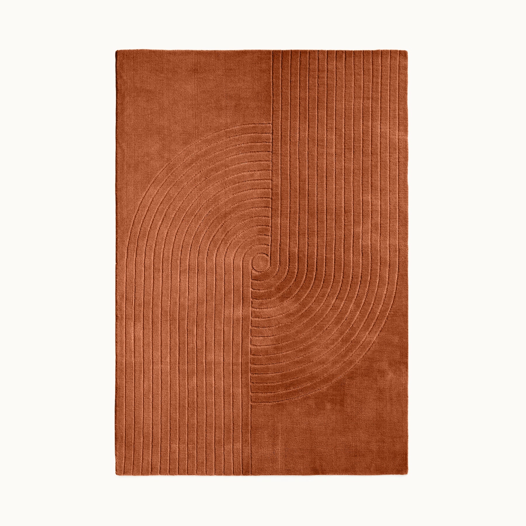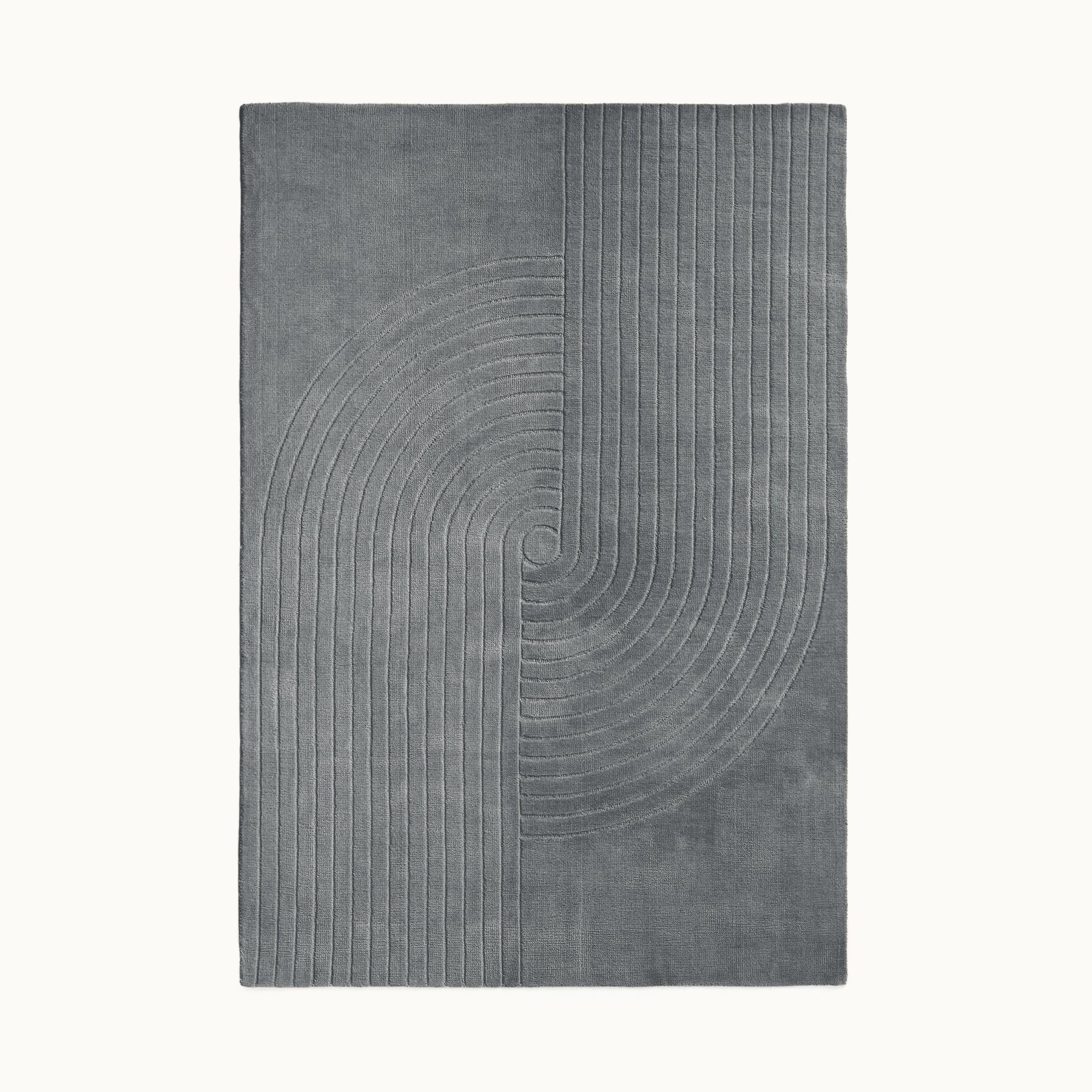中心から広がるような立体的なラインが印象的で、シンプルな空間にもリズムと奥行きを生み出すデザインラグです。