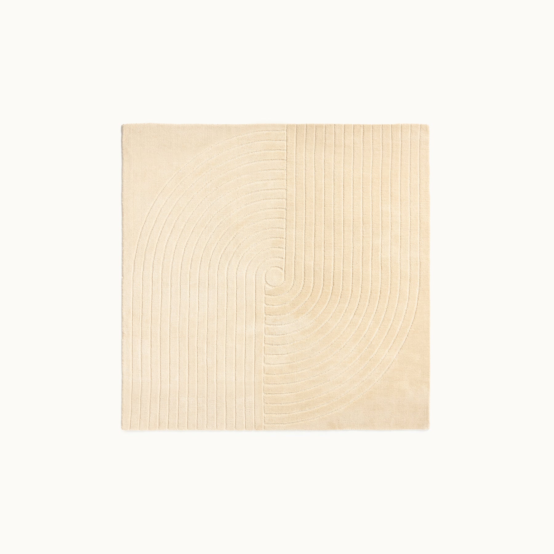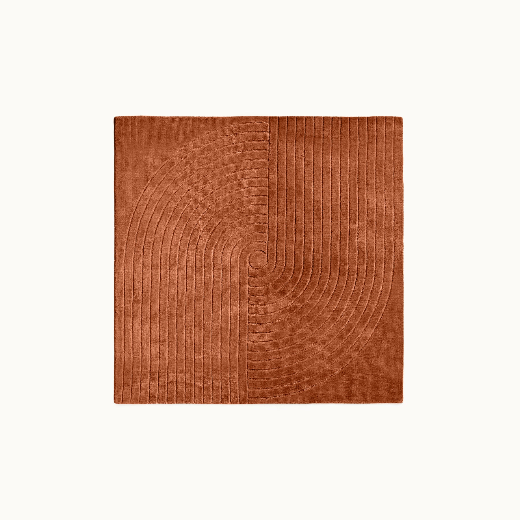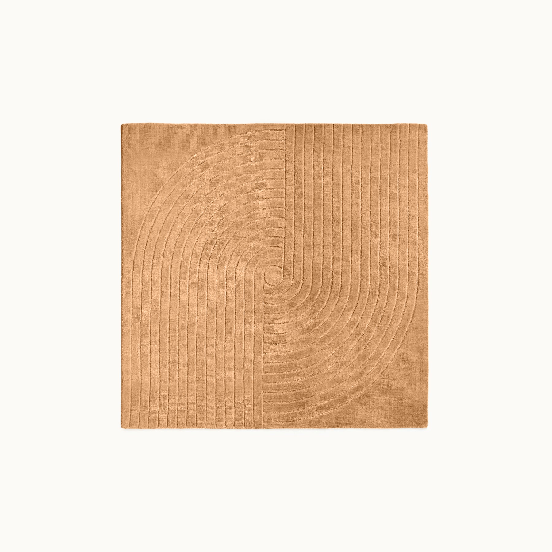 中心から広がるような立体的なラインが印象的で、シンプルな空間にもリズムと奥行きを生み出すデザインラグです。