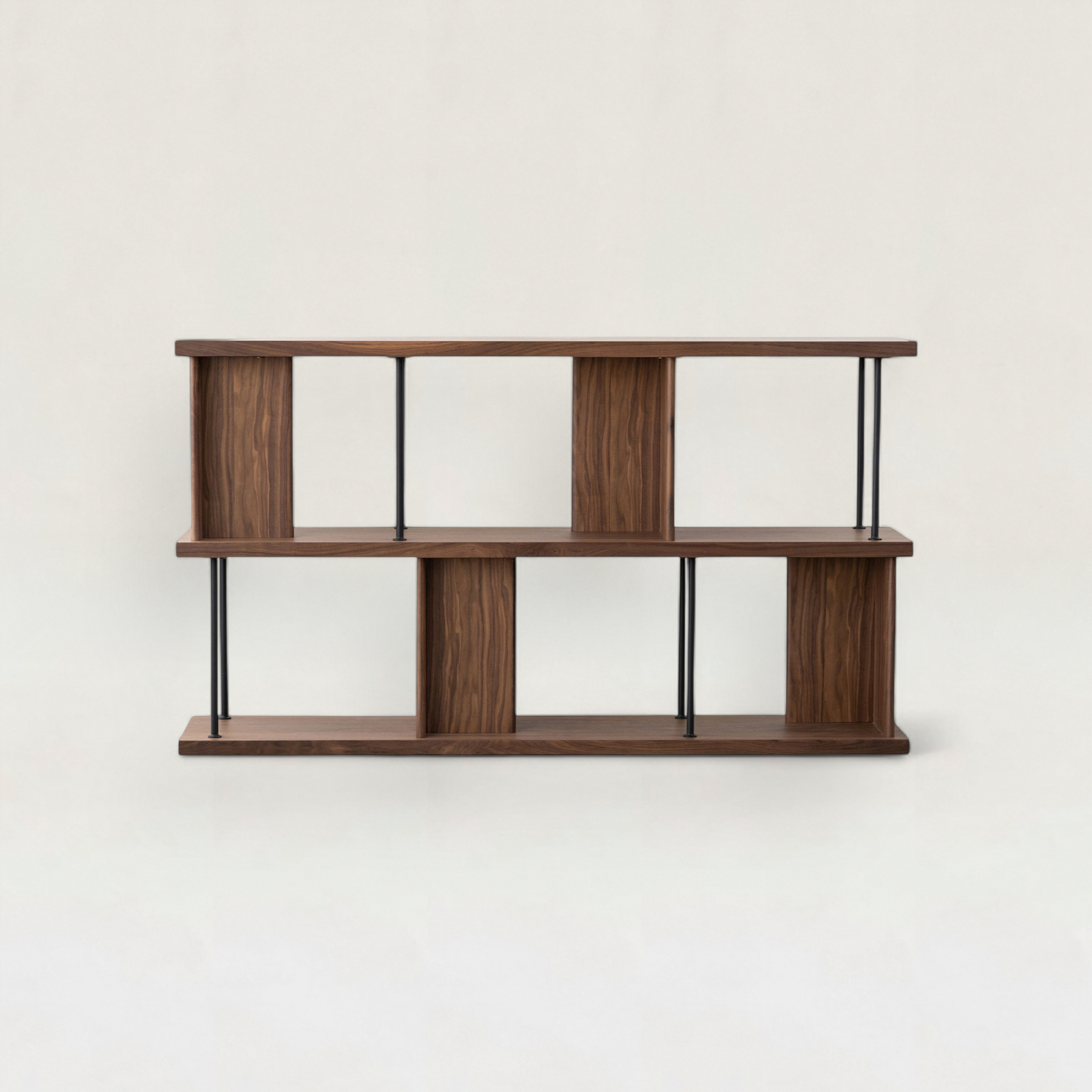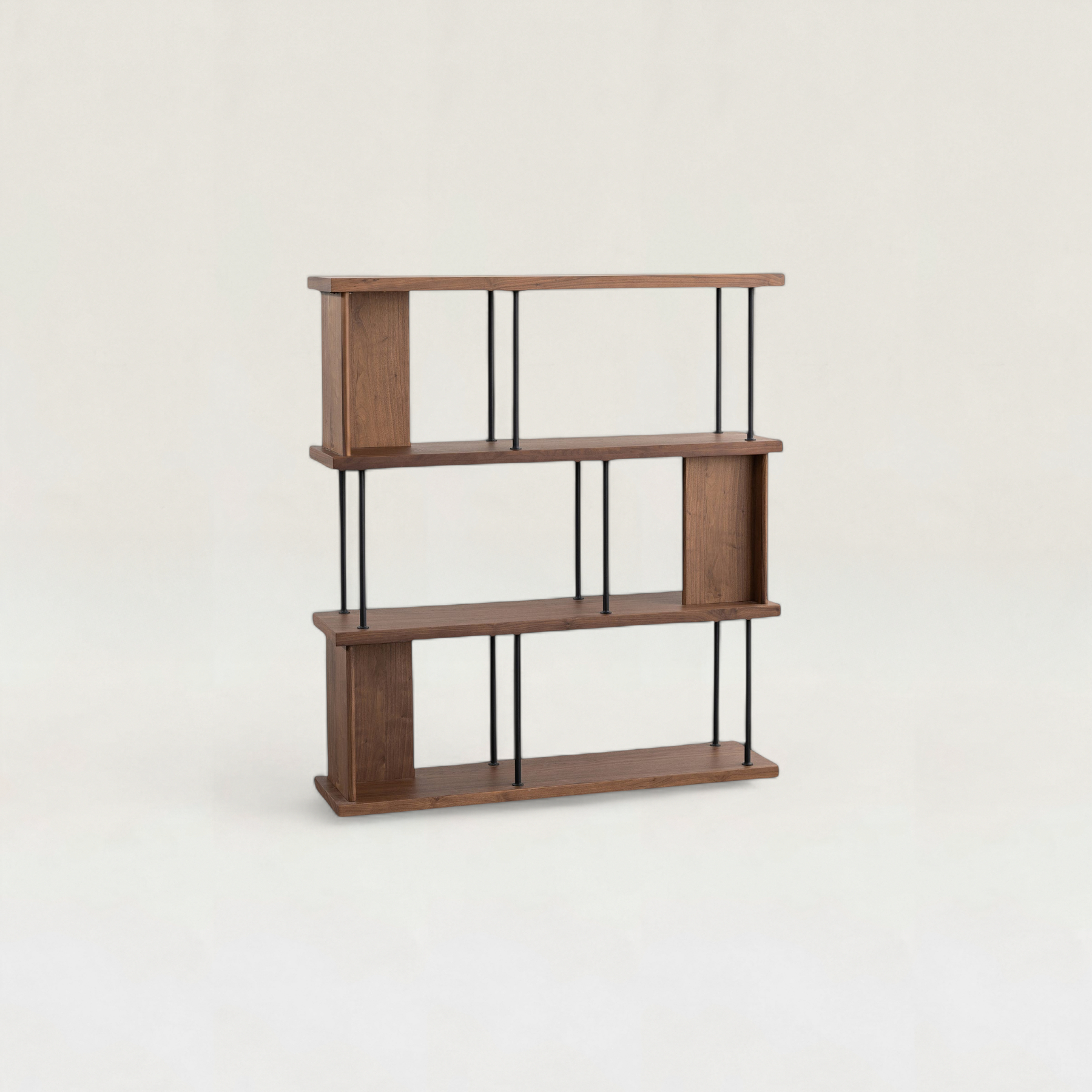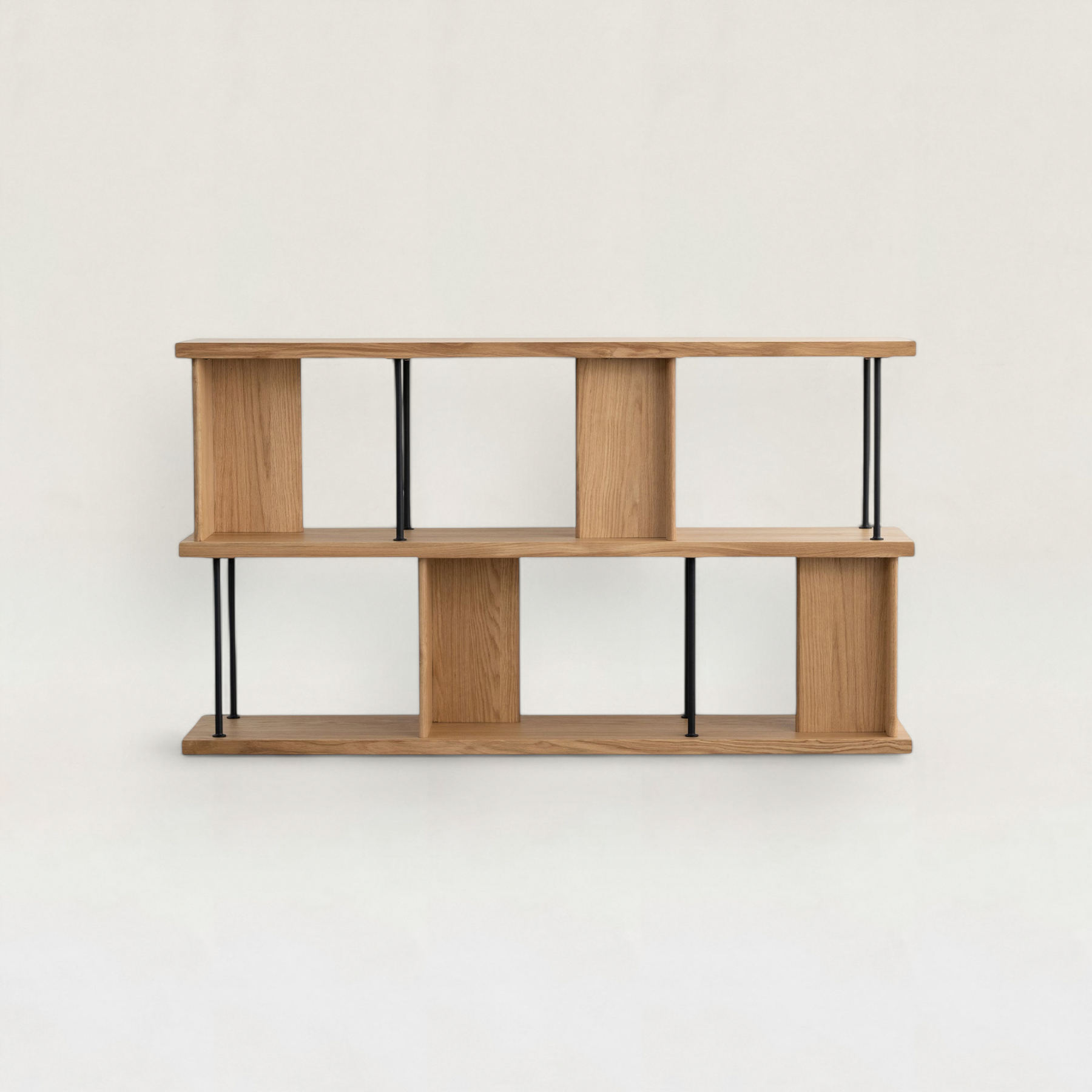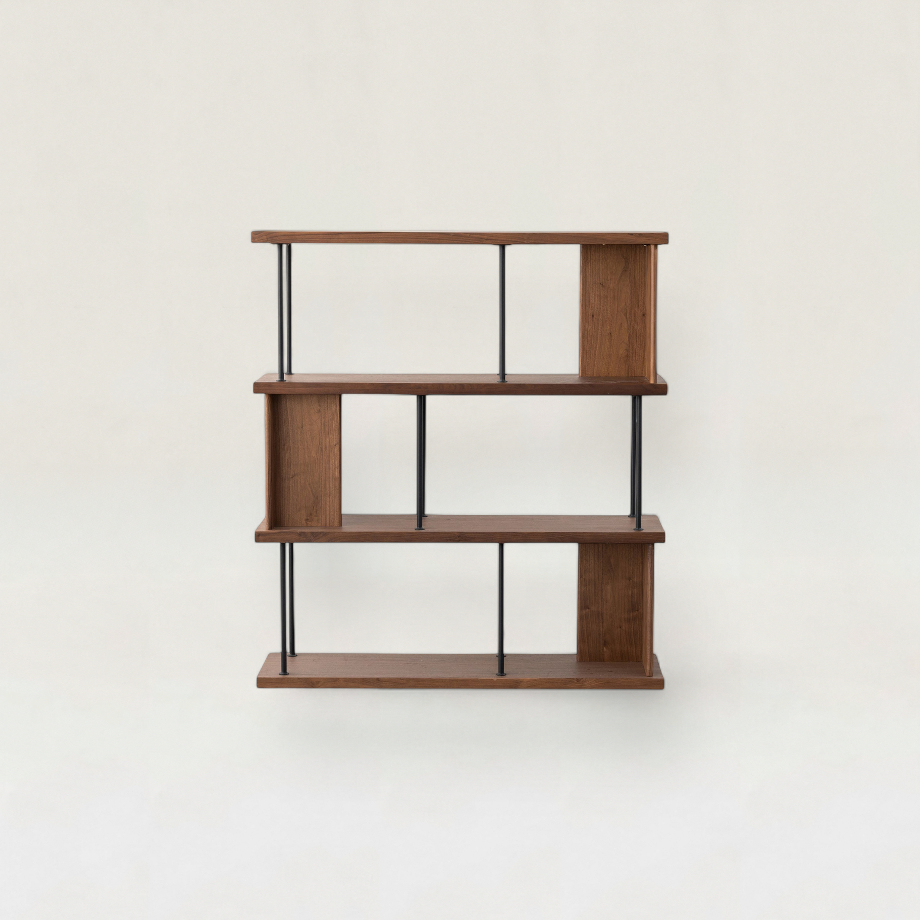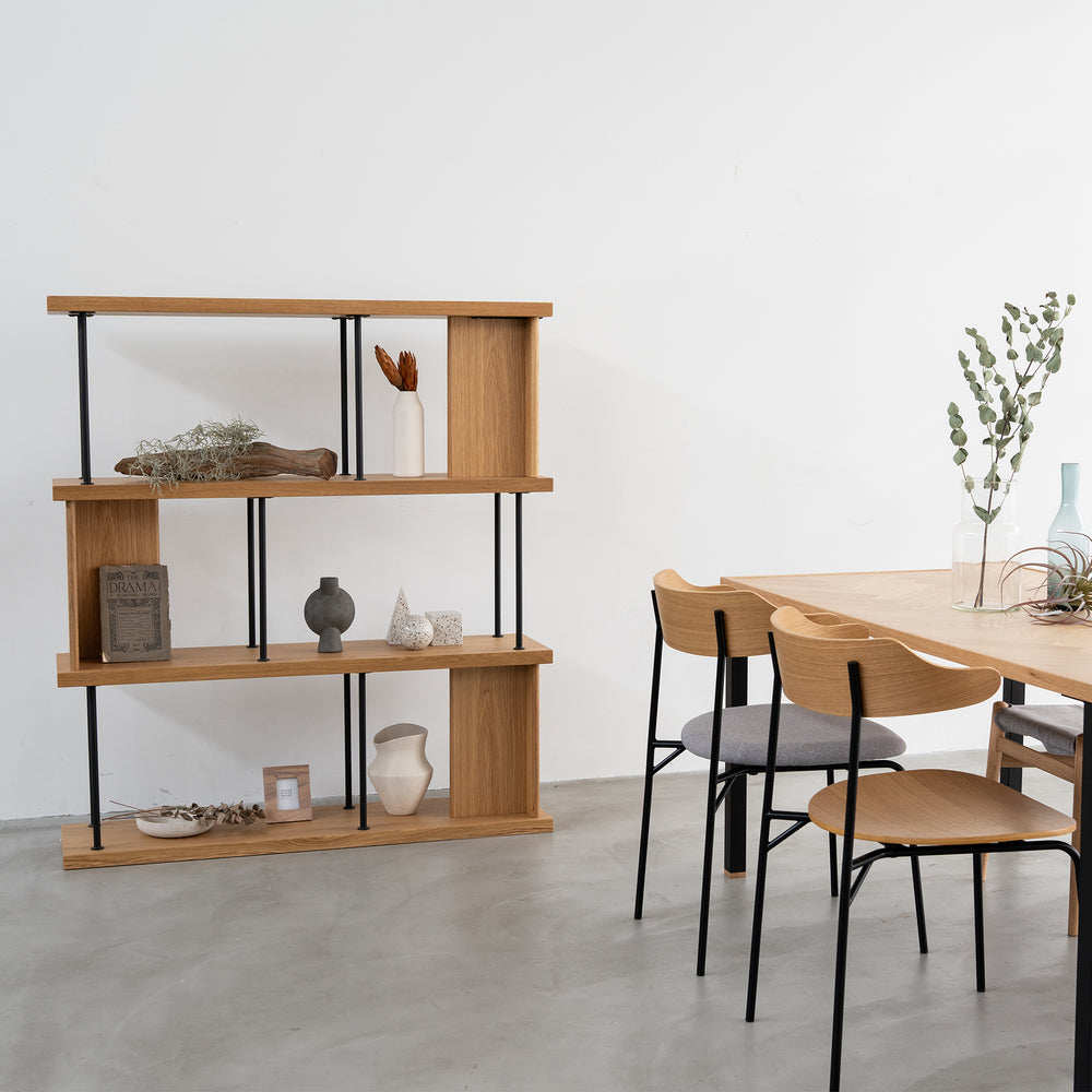 ランダムに並ぶ棚板が目を惹く、個性ある佇まいのシェルフです。高めの収納になっていて、花や本もすっと収まり、空間に自然なアクセントを与えます。